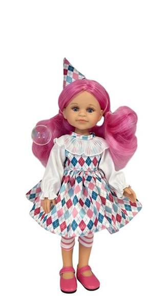 La muñeca amiga 32 cm con ropa Cleo Arlequín destaca por su cuidada estética. Su diseño de arlequín, con colores vibrantes y detalles encantadores, captura la atención de inmediato. El pelo rosa suave y brillante añade un toque de fantasía que enamorará a tu hija. Pero Cleo no es solo apariencia; su calidad de fabricación garantiza horas y horas de juego seguro y duradero.