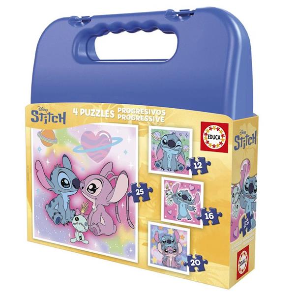 El Puzzle Maleta Progresivos Stitch 12-16-20-25 es mucho más que un simple juego. Es una herramienta educativa que fomenta el desarrollo de habilidades esenciales para el crecimiento de tus hijos. Al manipular las piezas, están mejorando su coordinación mano-ojo y su motricidad fina. La necesidad de identificar patrones y encajar las piezas correctamente estimula su pensamiento lógico y su capacidad de resolución de problemas.