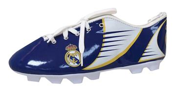 Estupendo estuche en forma de zapatilla de un tamaño real con cordones con el diseño de la 1ª equipación de la temporada 20/21 del Real Madrid.